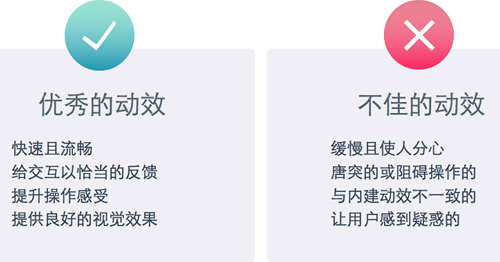 這是一個(gè)非常棒的動效設(shè)計(jì)建議,甚至可以說是原則。作為這些Web或者App的設(shè)計(jì)和開發(fā)者,在我們設(shè)計(jì)和開發(fā)動效之前,首先應(yīng)該明確什么才是正確的動效:動效應(yīng)該是以提高可用性為前提,并且以令人覺得自然,含蓄的方式提供有效用戶反饋的一種機(jī)制。