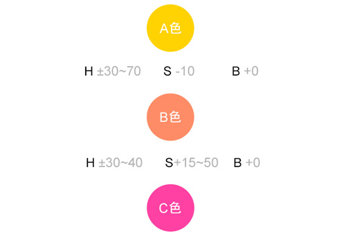 從B色到C色,H值的變化范圍為正負30到40,S值增加15到50,說明C顏色開始變濃。