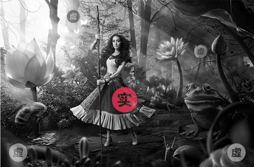 畫面的層次感,說白了其實就是畫面的內容有主次之分,有空間感和距離感,有虛實之分,光影層次清晰,這樣的畫面才起來才真實、豐富,而且通過一些特殊的處理手法,可以進一步拉開畫面中不同元素的層次,使得主體更加突出。(因本部分的講解不涉及到色彩方面的知識,為了更便于大家觀察,所以對海報進行了去色處理)