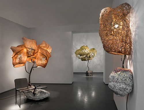 設計師:nacho carbonell西班牙藝術家nacho carbonell 首次對外展示了他最新的非常規燈雕作品,本次展覽被命名為forest,涵蓋了nacho carbonell一系列的標志性作品,即把實用性的燈和鮮活的有機雕塑進行了“童話般”的融合。藝術家制作了一種獨特的石膏形式-由carbonell發明-跟沙子和紡織固化劑一起使用,然后包圍在鋼支架上,創作了一系列超自然的、迷人的雕塑作品,巧妙地集藝術和設計于一身。結構松散的沙子顏色的網格在燈泡周圍構成了一個透明的燈罩,使得燈光透過燈罩發出溫暖而柔和的光輝。
