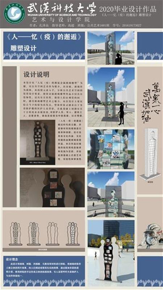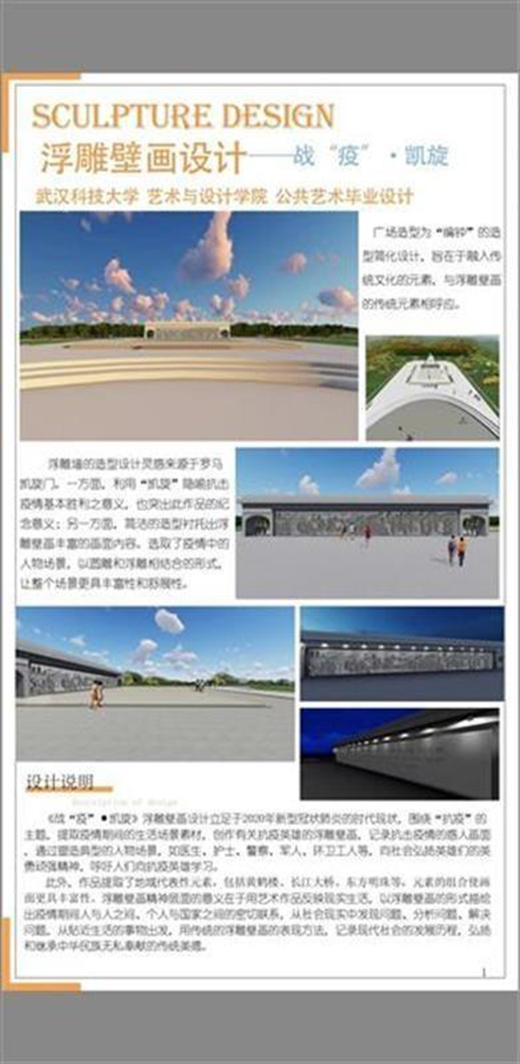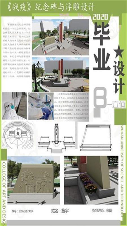 公共藝術(shù)設(shè)計(jì)專業(yè)2020屆畢業(yè)生施宇,作品名稱是《戰(zhàn)疫》紀(jì)念碑與浮雕設(shè)計(jì)。該作品的設(shè)計(jì)通過紀(jì)念碑浮雕營造一個(gè)紀(jì)念性場(chǎng)所。紀(jì)念碑是人類藝術(shù)史上一個(gè)重要的藝術(shù)類型。浮雕具有比雕塑更強(qiáng)的敘事性同時(shí)也不失一般雕塑的表現(xiàn)性。本紀(jì)念碑與浮雕設(shè)計(jì)則是對(duì)此次疫情的記錄,對(duì)疫情期間涌現(xiàn)的抗疫英雄的記錄,是對(duì)他們不畏艱險(xiǎn)、逆行而上、自我犧牲精神的贊美與傳承,是向英雄的致敬。