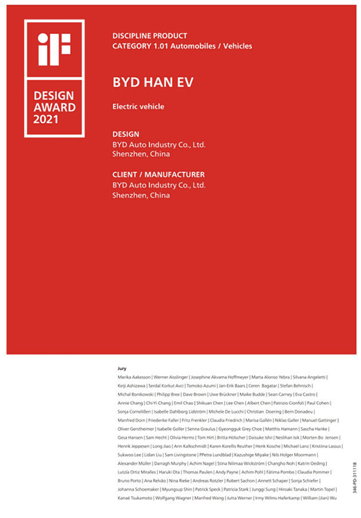 此次德國iF設(shè)計獎評選,云集了來自世界各地的98位評審團成員,他們給予了比亞迪漢EV高度的評價:“比亞迪漢EV為中國用戶提供了健康、安全、環(huán)保的日常通勤和家庭出行解決方案。漢EV從中國傳統(tǒng)文化中汲取設(shè)計靈感,其新潮前衛(wèi)的外觀以及大氣豪華的內(nèi)飾設(shè)計重新詮釋了中國獨特的傳統(tǒng)美學。與此同時,漢EV百公里加速3.9s的出色性能,搭配智能網(wǎng)聯(lián)系統(tǒng),都使得駕駛體驗更加令人興奮。”