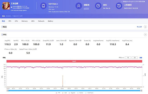 而在游戲測試環節中,iQOO 9 Pro賽道版也有著出色的表現。從下圖可以看到,該機在運行120幀《王者榮耀》時,平均幀率達到了118.3,幾乎接近滿幀狀態,并且幀率曲線較為平緩,整個游戲過程非常流暢。