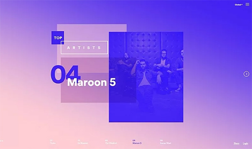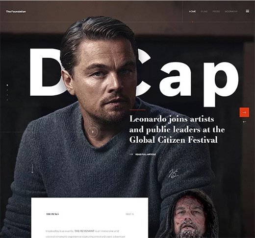 1.增強層次感下面的網站是小李子電影宣傳網站。設計師大膽的利用色塊和主視覺人像進行重疊,不僅讓文案信息在版面中節省了空間清晰的展示。而且還給整個網站視覺增加了層次感。真正做到了給用戶有遠有近的感覺。