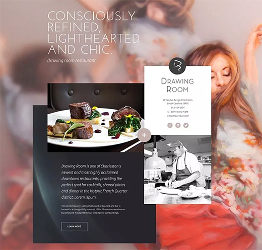 3.強化品牌宣傳下面是一家牛排店的宣傳海報。設計師同樣選取了大的背景圖,讓板塊和圖片之間進行重疊搭配,使視覺上做到了極大的突破同時又能有效的給用戶傳達出畫面強烈的氛圍。