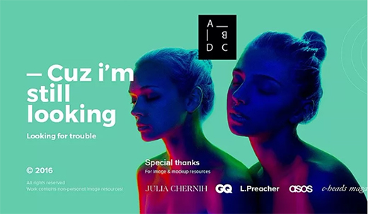 利用鮮明的對比色彩進行重疊搭配,使設計更具有視覺沖擊力和吸引力。設計師將模特用亮紫色漸變到藍綠色和背景進行的重疊搭配改造。極大的增強了視覺沖擊力!