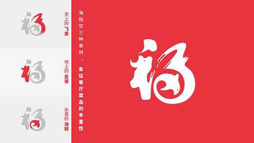 到底什么是好LOGO?LOGO對于受眾就是一個圖像,綁定品牌的產品。而不是荒謬的推導邏輯,我直觀看到你是什么就是什么,用戶絕不會看著設計說明書來理解LOGO的深意,我對好設計的判定標準是:好設計=看得懂、記得住,輔助傳播。悅福源LOGO選用福字為主形象,一眼看懂,圖形中添加海陸空食材,象征餐廳食材豐富性。