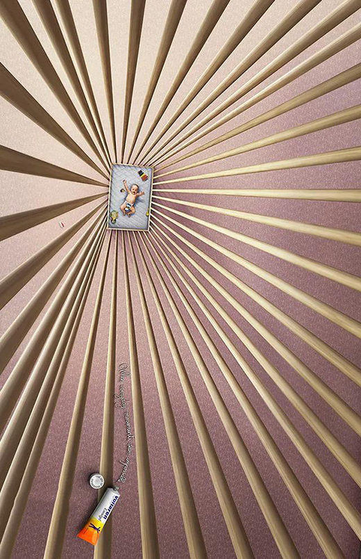 ●線的發射。當視覺元素的長度與寬度的比例差距較大時,我們就能將其稱為線。將具有線形特征的視覺元素,向不同的方向進行發射性的排列,這就是所謂的線的發射構成原理,能使畫面具有較強的動感。
