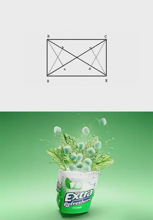 在以1:1.618比例構成的矩形ABCD上,畫出對角線AC、DB,并過A、B、C、E4點作AC、EB的垂直線,得垂足a、b、c、d,此法可以簡化尋找美感誘發點的方法(還是直接看圖吧)。