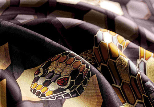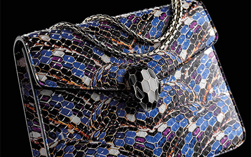 Quilted Scaglie鱗片衍縫刺繡手袋為營造出更好的靈蛇效果,保留蟒蛇皮觸感,完美還原蛇鱗效果,皇家藍寶石色、紫水晶色和常春藤碧璽色觸手可及。2017年春夏配飾系列Quilted Scaglie鱗片衍縫刺繡手袋采用啞光琺瑯蛇頭、黑瑪瑙蛇眼和軟羊皮內(nèi)襯,以拼布手法將靈蛇縫入。這款手袋的誕生可謂“無心之失”下的妙手偶得。在第一次拼裝時,負(fù)責(zé)的工匠意識到,在將后幅向前彎曲形成包蓋時,手袋正面的圖案并不對稱。但同時,他們也發(fā)現(xiàn)最終的視覺效果極為優(yōu)雅美麗,充滿吸引力。因此,他們決定保留這一“無心之失”,并將拼布技術(shù)一直流傳下來,成為寶格麗的獨特標(biāo)簽。有趣的是,這一設(shè)計步驟也是制造中最難的一步,為營造誘人效果,拼布皮革需要兩片V形刺繡和一片與蛇鱗重疊的軟羊皮刺繡裝飾。為達到最終的完美對稱效果,每一片鱗片均無比小心地縫入,打破常規(guī),令人驚嘆。