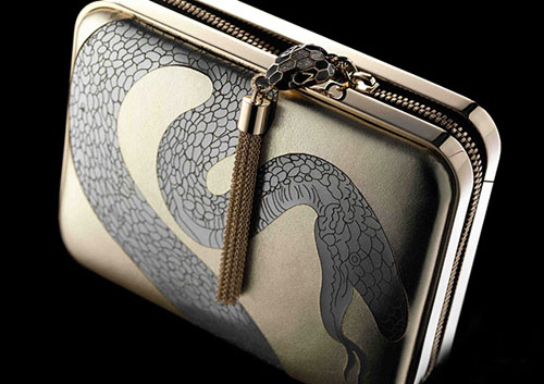 Serpenti Clutch Dragone晚宴包的設(shè)計靈感來自寶格麗Heritage典藏系列里一只復(fù)古蜜瓜晚宴包。金銀或黑銀相間,包身由兩塊金屬皮革板構(gòu)成。皮革板首先分別進行處理,之后在邊緣處壓合成一體,這種獨特的制作方法效果令人驚嘆。激光在其中一塊皮革板上刻出龍形圖案,再精巧地刻出龍的鱗片。第二塊皮革板也由激光刻出以完全符合龍身形狀,再和第一塊相貼合,最后由一種特殊的粘合噴霧固定,這條龍已經(jīng)蓄勢待發(fā),在夜色里大放異彩了。