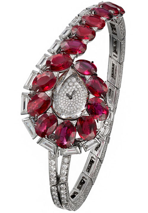 18K白金,15顆明紅色橢圓形莫桑比克紅寶石,總重24.93克拉,長階梯形切割鉆石,明亮式切割圓鉆,搭載卡地亞101型手動上鏈機械機芯。