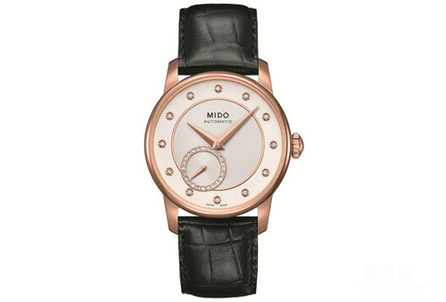 瑞士美度表貝倫賽麗典藏系列紀念款超薄女士腕表,搭載美度1192全自動機械機芯(以ETA 2892A2為基礎),表達當代女性端莊外表及無懈的內在力量。黑色小牛皮軋鱷魚紋真皮表帶性感而雅致,搭配PVD鍍玫瑰金不銹鋼表殼與表扣,于細節中彰顯簡約、大氣的潮流趨勢。純凈的象牙白飾紋表盤搭配烤藍鋼秒針,透明表背可清晰觀測到其精雕細琢、配以藍色螺絲的全自動機械機芯,以及雕刻著日內瓦波紋和MIDO標志的自動擺陀。