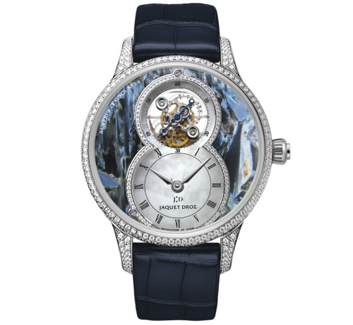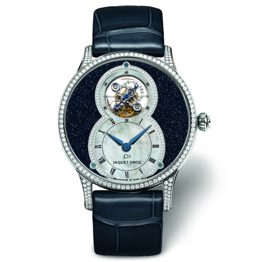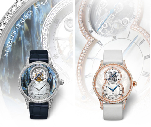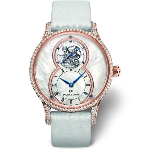 同時雅克德羅首次為陀飛輪裝配硅質擒縱叉和擺輪游絲,讓此令人目眩神迷的微雕杰作具備高精準度,珍珠母貝陀飛輪大秒針兼具優雅設計和卓越技術性能,精巧獨妙,彌足珍貴。此表款限量發行88枚。數字8的輪廓與表盤設計相互呼應,表盤熠熠閃耀著珍珠母貝的柔光淡彩與鉆石的璀璨光芒。