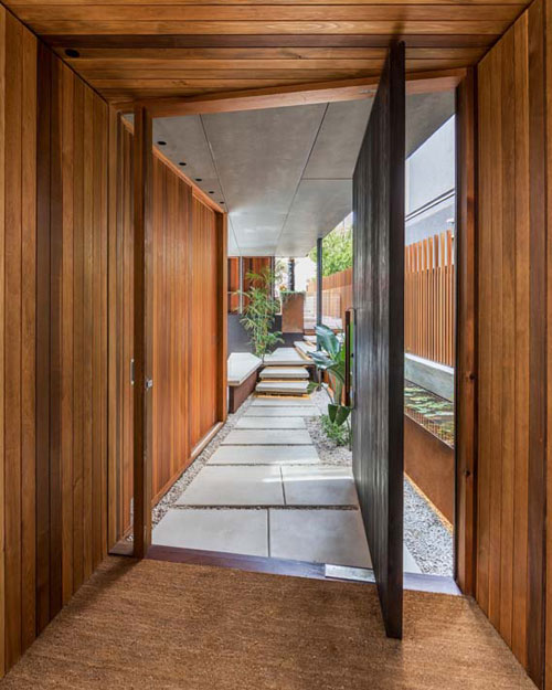 NCplusC建筑工作室最近完成了一個位于悉尼狹窄地段的私人住宅。房子的外觀由一個帶有窗戶和穿孔金屬面板的木格柵組成,這些金屬板成了垂直綠化的棲息地。從庭院通過一個旋轉木質門,便可以進入家中。