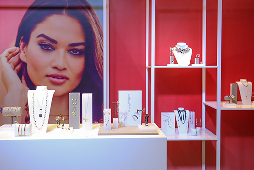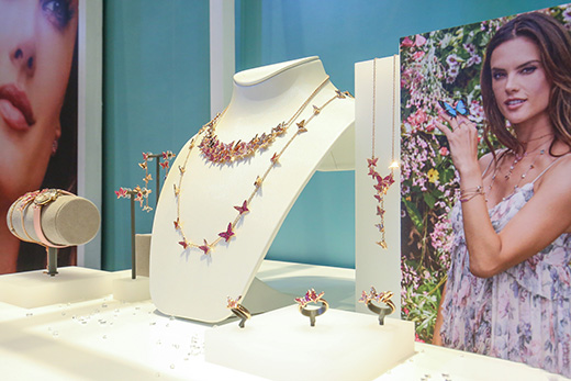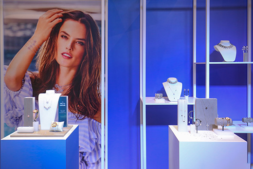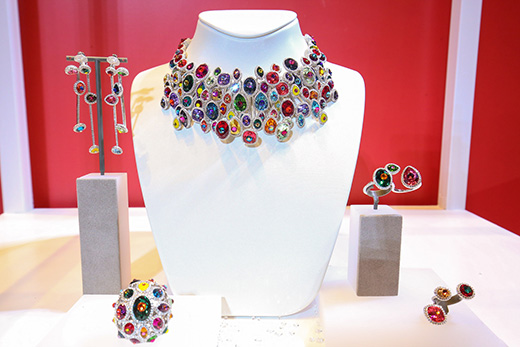 與本季彩虹樂園主題相契合,展區入口以神秘的彩色圓拱形通道引領賓客,步入內場猶如置身五光十色的彩虹樂園,處處洋溢著斑斕的色彩與豐富多樣的自然圖案。顏色鮮明的展臺、大幅海報、鮮花抱枕等活動裝飾賦予現場五彩魅力,玩味十足的3D立體拍照墻也為到場賓友帶來無限趣味與活力。華麗典雅的高級珠寶系列位居一隅耀眼迷人,光芒四射,晶璨閃亮。