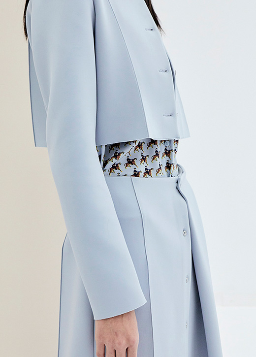 本季貨品延續了以往經典的 Clear Cut、平裁等手法,繼續著重探索材質與廓形的組合關系, 以“少有趣味”為主題,用輕松有趣的方式呈現簡約感。 “少”代表極致鮮明的風格,“趣味”則是輕松的態度,兩者構成意料之外的融合與錯位。利落的職場元素與運動元素并行,工整的剪裁與抽象的印花恰如其分的融合,細膩的蕾絲將女性的優雅穿插于干練的廓形之中,形成材質的對比,克制,又千變萬化,碰撞出“少有趣味”的化學反應。