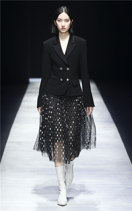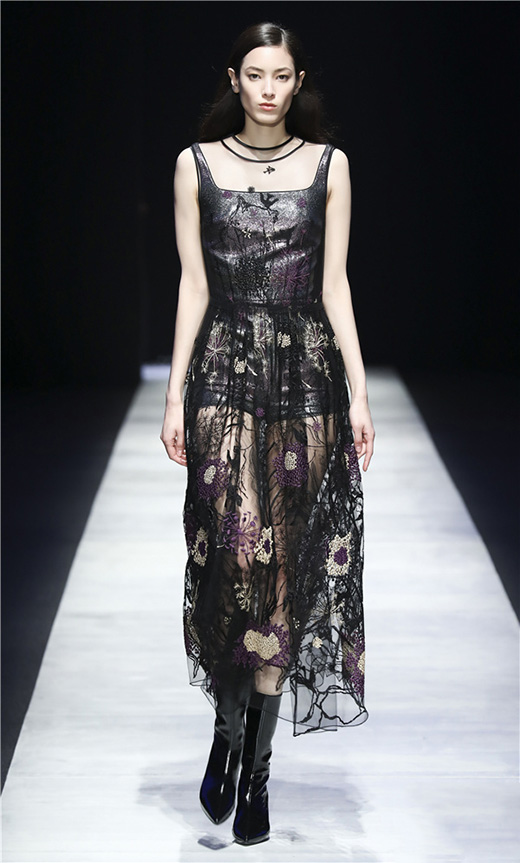 及至繁星掛上夜幕,無(wú)垠星河閃爍成一個(gè)浪漫靜謐的夜晚。閃光金屬感和解構(gòu)式剪裁在高級(jí)精致的女性化風(fēng)貌中加入了絲絲未來(lái)的氣息。如夜空靜謐的黑與浪漫藍(lán)中,閃光材質(zhì)耀熠著斑斕五彩的星光,通透的網(wǎng)紗、歐根紗和星云色條共同搭建起一片幻美而真實(shí)的世界。鑲嵌有鉆鏈、手工刺繡、羽毛等高定細(xì)節(jié)的優(yōu)雅小禮服搖曳出穿梭于過(guò)去與未來(lái)、現(xiàn)實(shí)與超現(xiàn)實(shí)之間的精彩新女性生活。
