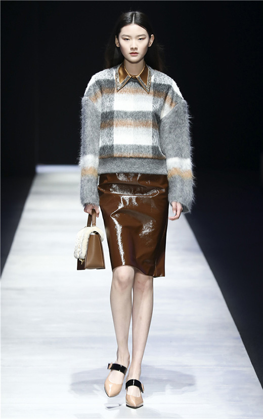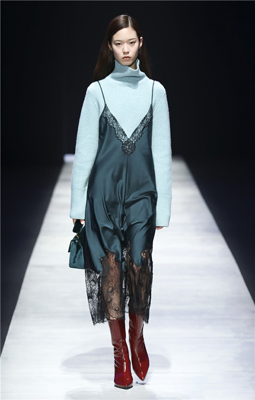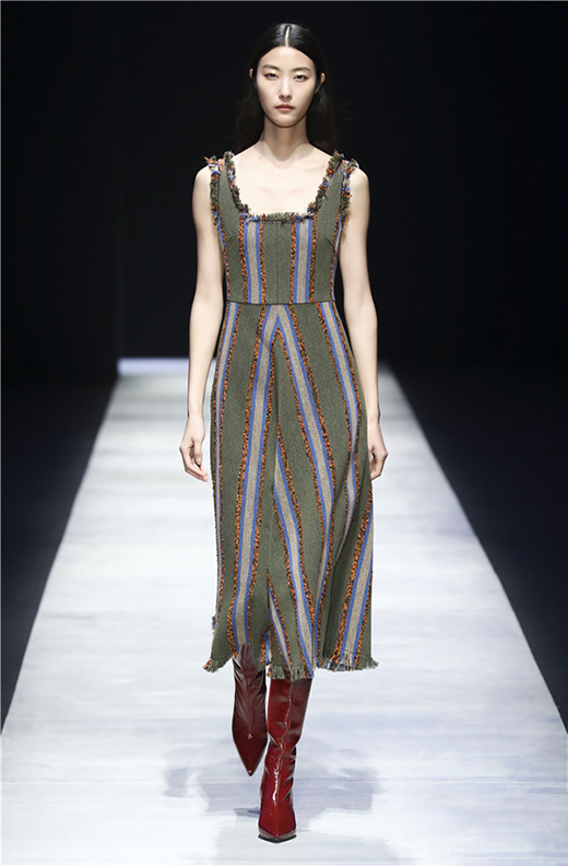系列通過(guò)色彩與材質(zhì)的對(duì)撞與層疊搭配展現(xiàn)自然優(yōu)雅、摩登當(dāng)代、精致且女性化十足的新女性造型。外套采用手工感提花和細(xì)膩的羊毛等溫暖感材質(zhì),剪裁成擁有利落肩型和修長(zhǎng)腰身的當(dāng)代摩登風(fēng)貌。流動(dòng)感的剪裁被應(yīng)用于合體修身的連衣裙裝,流蘇、刺繡、摩登領(lǐng)片、閃亮裝飾等精致細(xì)節(jié)又為優(yōu)雅浪漫的線條感平添了一份精致品味。寬松的粗棒針羊絨針織帶來(lái)蓬松感的溫暖,而多色提花針織中加入金蔥,以迷你短打的箱型結(jié)構(gòu)令整組系列的層次更加豐富靈動(dòng)。