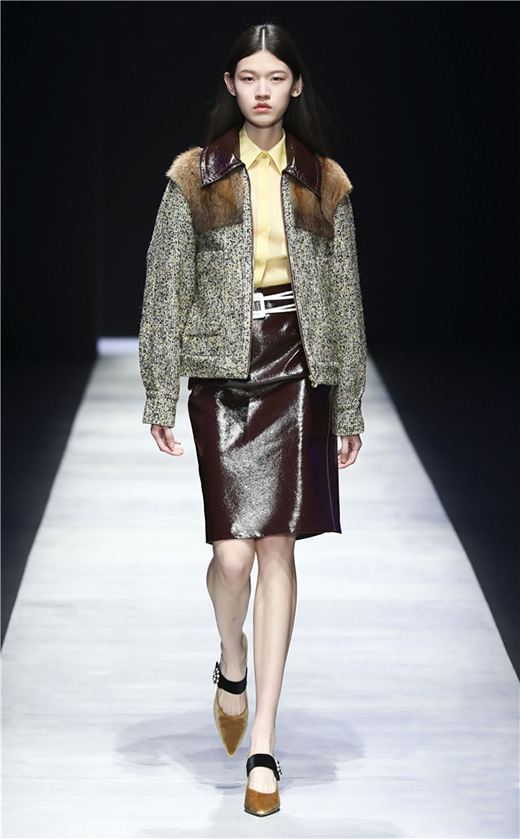 耀眼光輝下是一個(gè)充滿信仰的民族人文之境,一抹醇郁的藤黃之中輔以天際藍(lán)構(gòu)成本系列的主色調(diào)。質(zhì)樸且重手工感的提花織物、粗花呢、燈芯絨、絲絨與現(xiàn)代漆皮、剪花提花等強(qiáng)裝飾性對(duì)比材質(zhì)碰撞融合,與現(xiàn)代感運(yùn)動(dòng)邊條和圖騰提花、刺繡混搭出高原濃烈的時(shí)髦風(fēng)貌。箱型短打夾克與超長(zhǎng)裙裝等當(dāng)代感廓型則將濃郁的民族感演繹的獨(dú)特且摩登。
