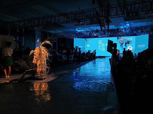 作為在全球興起的一種新的健康可持續生活方式,樂活首先要有一顆透明、純粹的內心。因此,整個秀場的設計基調是透明而利落的,無論是走秀的地面,還是高高吊掛著的背景燈,純凈得就如同身處深山大嶺之中只聽得見天籟之聲,讓來賓們拋下世間的煩擾,直面自己的內心。與此同時,遵循了SUPIN速品一直推崇的可持續再生的理念,秀場里運用到的很多道具都是“SUPIN速品”店鋪里的舊物,并在設計師的巧手下做成旋轉向上的造型,彰顯出勃勃生機的新動力,洋溢著樂觀自由的氣息。而旅行箱、自行車等元素的加入,正好表達了樂活族愛旅行、愛環保、愛運動的特質。此外,白色花藝的巧妙點綴更襯托出唯美、簡潔的氛圍。
