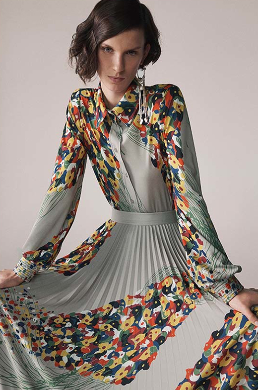 以黃色、棕色與灰色為基調,塑造溫柔浪漫的氣質。上衣和連衣裙飾以高級絲絨,柔軟輕質的羊毛搭配百褶上衣或是搭配絲綢、彈力面料晚裝連衣裙,打造優雅的風格。而棕色漸變皮質風衣、鴕鳥毛刺繡無袖束腰大衣則完美展現了精致上乘的工藝。五彩斑斕與黑白雙色花朵印花展現出溫柔與活力兼具的別樣風情。而一件灰白拼色風衣的靈感則來自廣袤無垠的地平線,營造出令人過目難忘的獨立氣質。