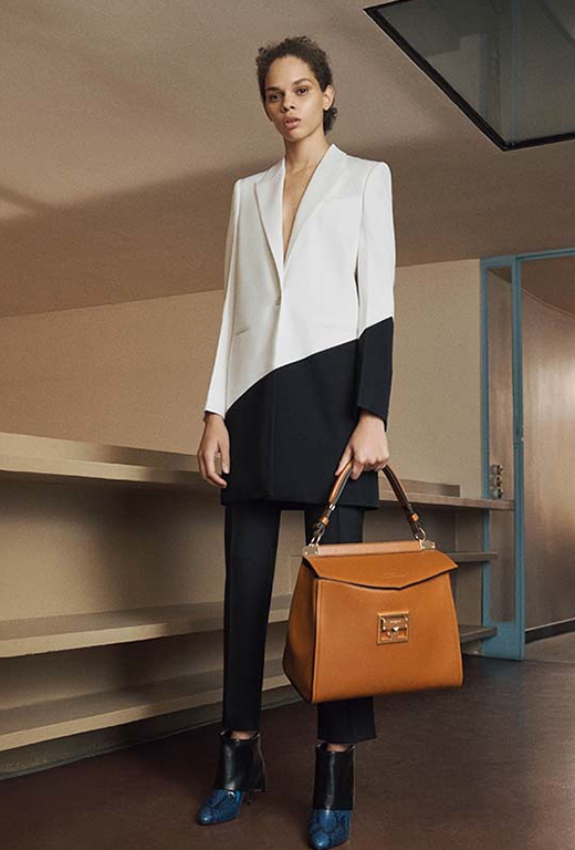 配飾方面,與成衣中的神秘氛圍保持一致,紀梵希全新推出Mystic系列女士手袋。該手袋的名字恰到好處地描繪了搭扣處半明半暗的結構設計:當手袋翻蓋合上時,從包身外側看,包蓋下會若隱若現地展現出對稱的雙G字母圖案;而當翻蓋打開時,搭扣處亮眼的方形金屬雙G圖案全貌才會完整顯現。Mystic系列手袋擁有簡潔的外部線條和寬敞的包內空間。材質上,包身采用了絲緞般柔軟的上乘牛皮,內襯則使用更為柔軟細膩的山羊皮。精湛的細節工藝和包蓋外緣的V形設計也是一大亮點。更為貼心的是,手柄的弧度設計貼合人體工程學,最大限度地提升了女性使用手袋的舒適度。手袋內壁的收納袋則增添了實用性。可拆卸并且可調節長度的肩帶也為手袋的造型方式提供了多重選擇。