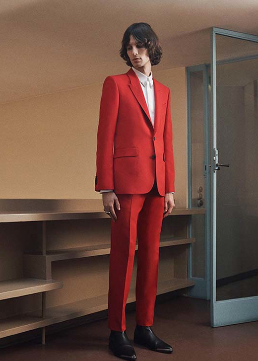 2019早秋系列男裝中的諸多設計元素取材于火鳳凰伊卡洛斯神,廓形延續了2018秋冬系列干凈而復古的線條。品牌經典的細條紋設計、驚艷的紀梵希紅色西服套裝,以及剪裁利落的外套也在本系列中得到充分地演繹。值得一提的是,男裝系列同樣分為三個時裝主題:伊卡洛斯神、太陽,以及人身牛頭的彌諾陶洛斯。伊卡洛斯神主題以淺藍色為主色調,太陽主題則以黃色及裸色系為代表,黑紅色系則象征著彌諾陶洛斯。系列中還有諸多軍裝風格的單品,如工裝連體衣、皮外套和大衣。這些單品的設計元素都取材自飛行員造型,以此射出飛翔中的伊卡洛斯神形象,帶來更加充滿活力的男士風格。
