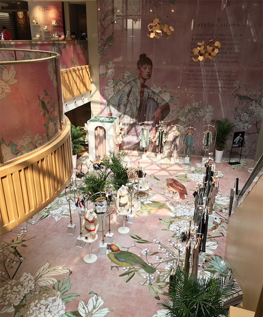 胭脂用盡的三月,桃花開了。靘將整個負二樓中庭用“延禧紅”覆蓋。從天到地全是品牌2019年的洛神驚鴻系列印花圖案,磚粉背景里的藝術印花,靈感來源于20世紀初歐洲的新藝術運動植物裝飾畫,配合宋朝的動物寫真風格,跨越中西千年的組合竟然默契不已,充分體現了摩登古典主義的美學主張。