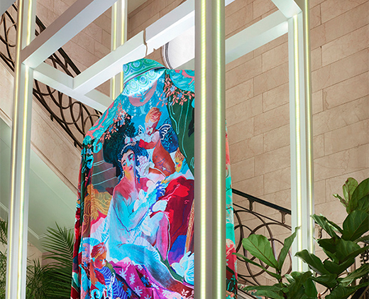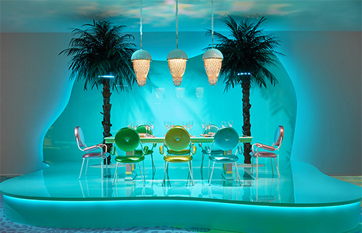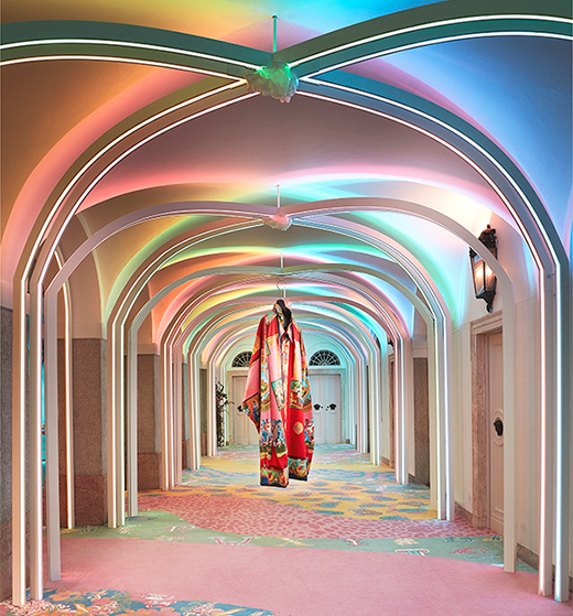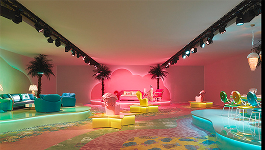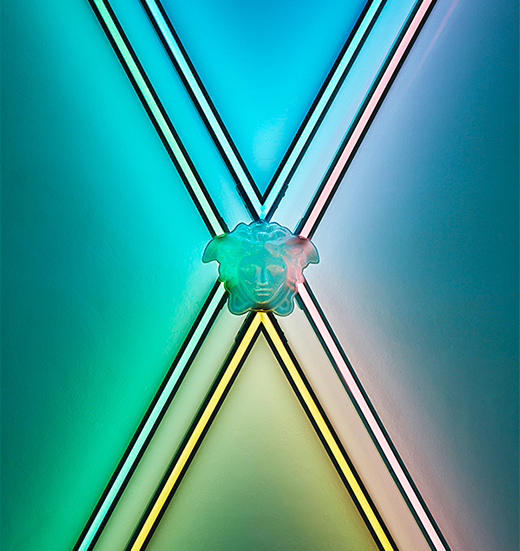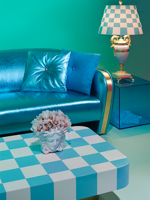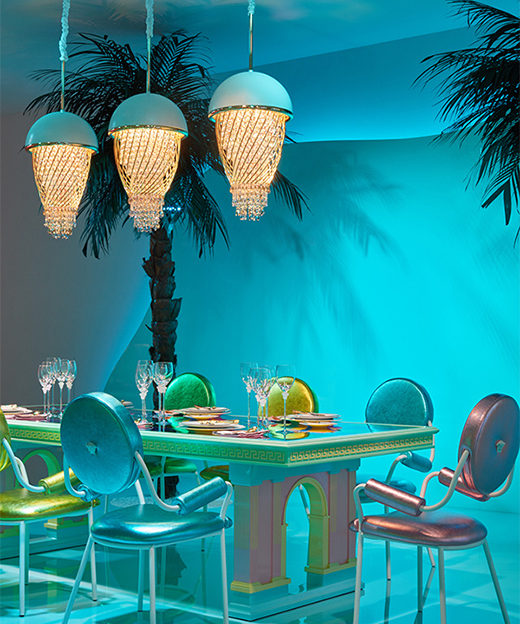 Bikoff 將為是次展覽創(chuàng)作藝術(shù)裝置場(chǎng)景,展示 Versace Home 系列的新品。其設(shè)計(jì)以 Richard Avedon 為 Versace 1994年秋冬廣告系列為創(chuàng)作藍(lán)本,建構(gòu)出連系 Versace 時(shí)裝與 Home 系列的橋梁。品牌的經(jīng)典圖案化身儼如棒棒糖的漩渦圖案地毯,熒光色的浮云和島嶼,為天馬行空的奇幻世界畫龍點(diǎn)睛。此外, Bikoff 更特別設(shè)計(jì)多個(gè)獨(dú)立場(chǎng)景,烘托品牌將經(jīng)典復(fù)刻并重新演繹的 Versace Home 系列,以玩味的手法向 Versace 圖案和素材致敬。她同時(shí)為 Versace 米蘭專門店及 Versace Home 家品店設(shè)計(jì)廚窗。