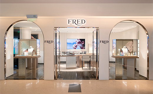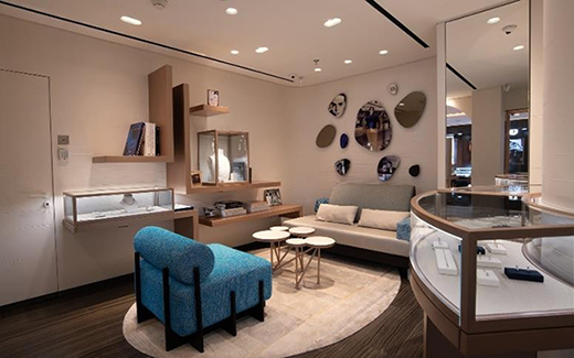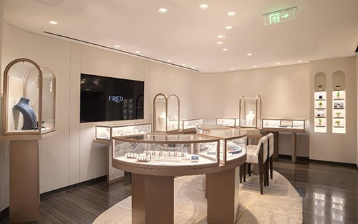 位于北京國貿商城的FRED 斐登店鋪以清新淡雅的珠光粉色和溫柔的海藍色為基調,展現女性如水般的晶瑩與柔美。流線設計與圓潤造型的珠寶陳列柜在引導賓客自由探索的同時,亦用線條打造出別致的現代簡約感,亦如法國里維埃拉海岸的優雅風情。傾心打造的貴賓休息室與男士系列區,飽滿的圓形桌面搭配輪廓感十足的方形沙發,線條感十足的書架搭配鵝卵石造型的古雅配件,在自然光的傾斜下,將珠寶的奢華與法式優雅融為一體,亦營造出賓至如歸的氛圍。