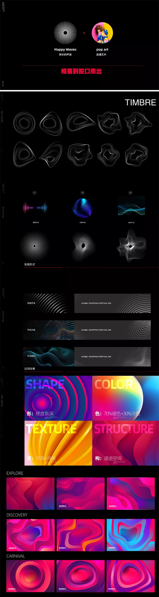 當(dāng)我們把它和波普藝術(shù)的主基調(diào)結(jié)合的時(shí)候,就形成了今年雙十一獨(dú)特的視覺語言,再通過形色質(zhì)構(gòu)的拆解,應(yīng)用到各個(gè)場景。