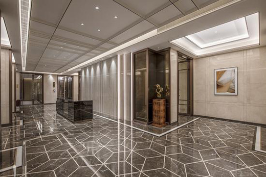 為增添幾凈雅致的氛圍,接待臺選用黑白根大理石,與背景墻共同構成了和諧統一又對比強烈的視覺主體。背景墻兩邊以屏風延伸,運用夾絲玻璃編織出細膩的紋絡,最外側點綴現代風格的藝術品,簡明精巧又不顯刻意地再次抬升了整體空間的格調。