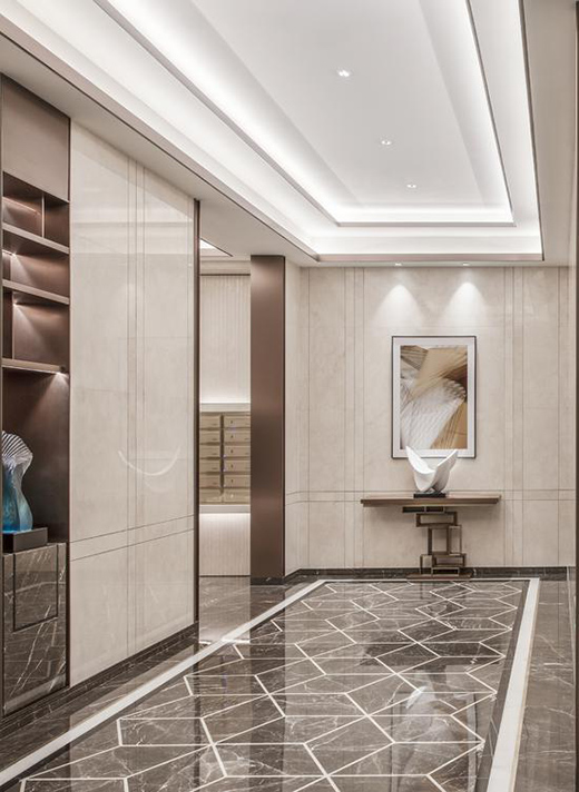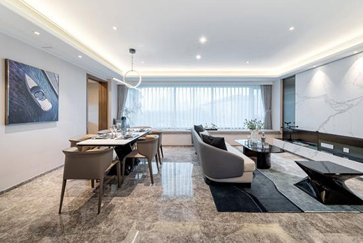 遵循“如無必要,勿增實體”的理念,設計師追溯室內設計本源,回歸建筑美學初心,摒棄繁冗復雜的元素堆砌,以精準的設計語言、獨特的設計視角、新奇的設計思路,充分發揮了空間與建筑、光影、材質、色澤的對話作用,不需一筆一墨,以空間為畫布、木石為畫筆,傳神、真切地刻畫出了現代菁英生活的真實寫照。
