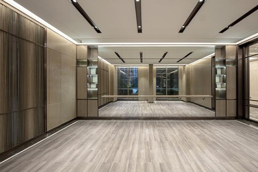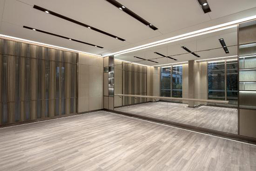 在傳統設計的基礎上做了獨特的差異化處理。按以往經驗看,瑜伽房需要開闊空間,不能添加阻礙人員活動的冗余裝飾,并且大部分墻面需要為練功鏡預留位置,本身留給設計師的發揮空間并不多。