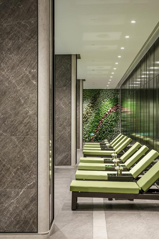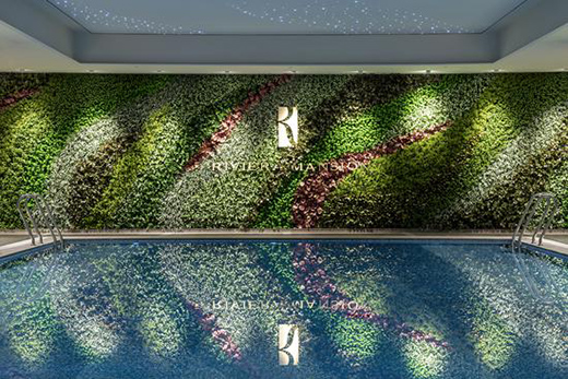 每一處細節的悉心考究,模糊了室內外的界限。泳池盡頭是一整片植物墻,淺青、深綠、紅棕……不同植物構成一條條斑斕的色帶,層次分明又渾然一體,不僅具備強烈的視覺沖擊感,也渲染出了十足的自然氣息。