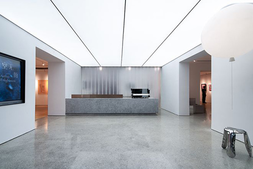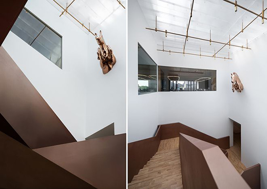 室內(nèi)光井將公共空間向上延伸,灑落的光線與室內(nèi)燈光不期而遇。光線的豐富層次為空間增添幾分靈動(dòng)與張揚(yáng)。設(shè)計(jì)用素混凝土和白色涂料兩種簡(jiǎn)單卻反差極大的材料,給展廳空間與公共交通空間創(chuàng)造了視覺(jué)邊界。
