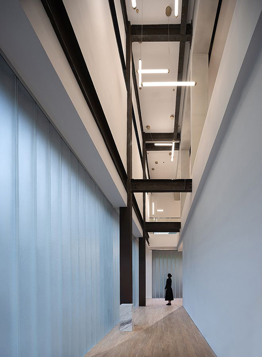 設(shè)計(jì)將建筑南側(cè)一層、二層的側(cè)庭打通,為內(nèi)部封閉展廳與外部光線之間提供了空間流動(dòng)界面。同時(shí),立面大面積的半透U玻取代實(shí)墻模糊了室內(nèi)外邊界,使側(cè)庭空間成為室內(nèi)外之間的緩沖與過(guò)度,置身其中可以意識(shí)和感知到室外空間的存在。側(cè)廳的設(shè)計(jì)運(yùn)用極簡(jiǎn)的建筑語(yǔ)言,所有多余的裝飾都被摒棄。直白裸露的鋼架結(jié)構(gòu)與最原始的建筑材料還原了結(jié)構(gòu)本身的美。U玻材質(zhì)與高窗的運(yùn)用避免了日光對(duì)展廳空間的直射,光線被選擇性的接受、阻擋和弱化。