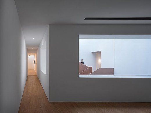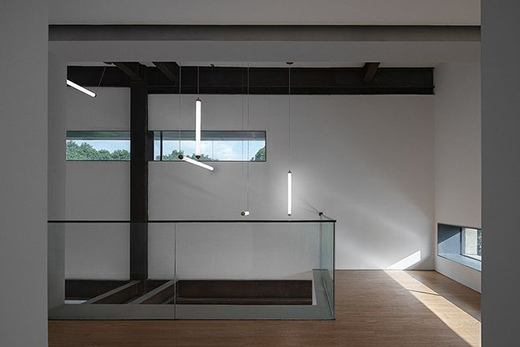 中庭頂部的玻璃有序排列,陽(yáng)光透過(guò)天窗溫柔地灑落,在潔白的墻面上自然形成明暗交替的斑駁光影。窗洞的設(shè)計(jì)運(yùn)用極簡(jiǎn)線條的設(shè)計(jì)語(yǔ)言,將被U玻天窗過(guò)濾一遍的穩(wěn)定光線引入各個(gè)室內(nèi)空間,由此產(chǎn)生靜謐的氛圍帶給人們天馬行空的思維導(dǎo)向,引發(fā)無(wú)限遐想。