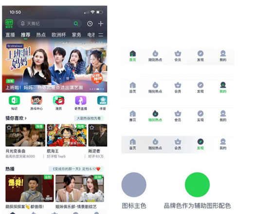 在配色上,輔助圖形還可以結(jié)合品牌色彩。嘗試加入以品牌色裝飾元素作為點(diǎn)綴,立馬就能提升圖標(biāo)細(xì)節(jié)。下面這個(gè)案例是愛奇藝的首頁圖標(biāo)設(shè)計(jì),能看出來它的輔助圖形設(shè)計(jì)配色上是按品牌綠色來設(shè)計(jì)的。品牌色的加入,能夠讓圖標(biāo)配色的使用找到立足的理由。