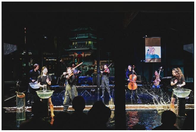 夜幕降臨,本次論壇結(jié)合建筑、自然與音樂的共性,邀請(qǐng)論壇嘉賓共同欣賞水樂堂演出《天頂上的一滴水》。此劇目是視聽藝術(shù)與弦樂四重奏、琵琶、女聲和打擊水樂的一個(gè)精彩現(xiàn)代音樂組合,充分表現(xiàn)了“建筑音樂”概念的特點(diǎn)。