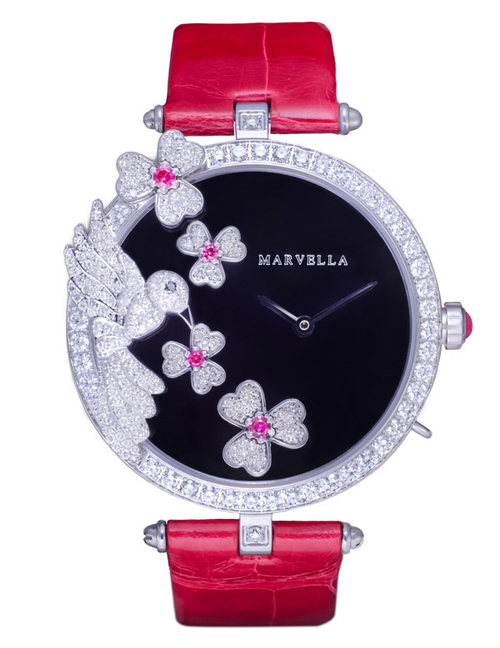 秋天的L’automne系列飽含深意,優雅的雀鳥在深秋的花朵舞池一側伸展羽翼,眼前立即浮現出一副自然和諧之景。(L’automne鑲嵌41顆鉆石,藍寶石水晶鏡面,表面上的立體花鳥裝飾鑲嵌144顆鉆石,另有黑鉆和紅寶石各1顆,黑色搪瓷表盤鑲嵌54顆鉆石,3顆紅寶石,鉆石重約2.34卡;瑞士制造石英機芯,紅色鱷魚真皮表愛的襯以鉆石鋼扣。)