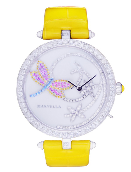 代表春天的Le printemps系列,以粉、藍、黃寶石鑲嵌勾勒的輕盈蜻蜓造型為軸,呼扇著翅膀靈動盤旋于白色搪瓷及鉆石之上,散發出生機勃勃的春之氣息。(Le printemps鑲嵌54顆鉆石,藍寶石水晶鏡面,白色搪瓷表盤鑲嵌118顆鉆石,56顆黃晶,31顆淺粉紅寶石,10顆淺藍寶石,鉆石共重約2.52 克拉;瑞士制造石英機芯,黃色鱷魚真皮表帶襯以鉆石鋼扣)