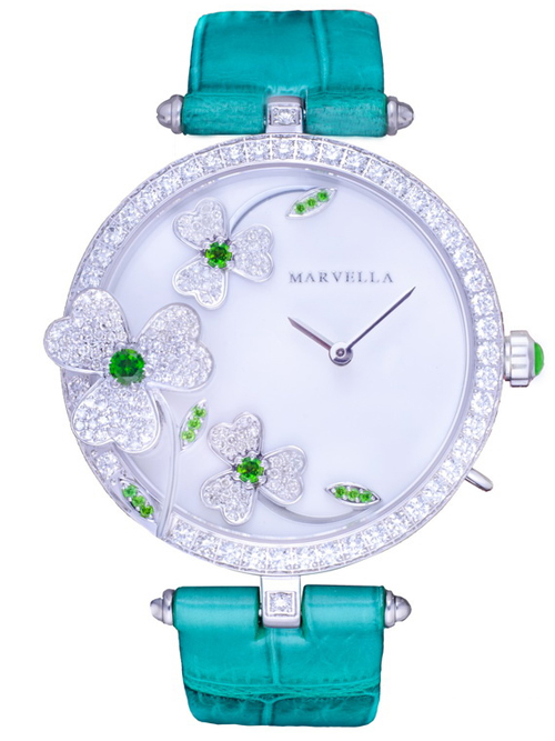 象征夏天的L’été系列,表盤上玲瓏立體的三葉草隨風飛揚,施施然呈現一派仲夏夜之夢般的歡樂氛圍。(L’été鑲嵌45顆鉆石,藍寶石水晶鏡面上的立體裝飾共鑲87顆鉆石,7顆透透輝石,白色搪瓷表盤鑲嵌54顆鉆石,8顆透輝石,鉆石重約2.25克拉;瑞士制造石英機芯,綠色鱷魚真皮表帶襯以鉆石鋼扣。)