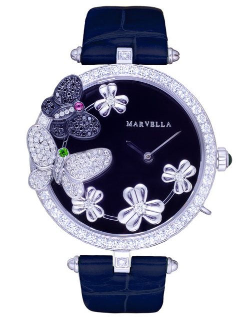 標志冬天的L’hiver系列中,三葉草覆蓋著晶瑩剔透的白雪,兩只披著黑白鉆石羽衣的蝴蝶雙雙相依,輕輕落在黑色搪瓷表盤上,營造出浪漫的冬日怡情。(L’hiver鑲嵌43顆鉆石,藍寶石水晶鏡面,表面上的立體蝴蝶鑲嵌91顆鉆石,44顆黑鉆,另有透輝石和紅寶石各1顆,黑色搪瓷表盤鑲嵌4顆鉆石,鉆石重約2.08克拉;瑞士制造石英機芯,藍色鱷魚真皮表帶襯以鉆石鋼扣。)