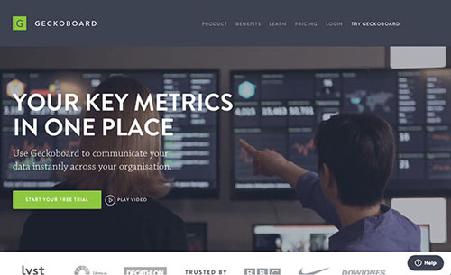 Geckoboard是一個展示公司指標的平臺。他們的產品——還有他們網站——都清晰地表明數據未必是無聊乏味的。他們的品牌涉及一些微妙而優雅的設計元素,例如絕妙的配色和精心挑選的字體。