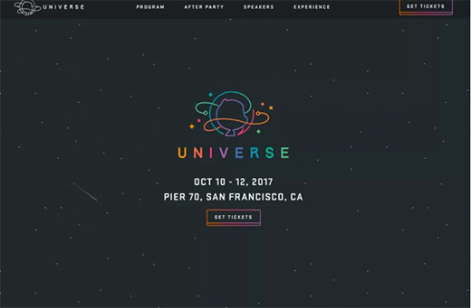 簡單而低調的背景紋理是提升整個設計的可用性的最佳方式。在去年的 Github 宇宙會議的頁面上,設計師就采用了簡單的黑色背景加上白色圓點的紋理設計,營造出夜空的效果。在夜空的映襯之下,多彩的 LOGO 和漸變的按鈕有著良好的可識別度。