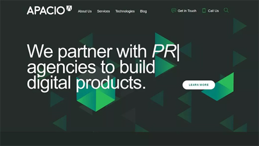 幾何圖形元素是時下流行的設計元素之一,將幾何圖形融入到背景當中,毫無疑問可以非常吸引人。看看 Apacio 這個網站的設計,深色的背景之上混合色彩鮮艷的幾何圖案,創建出富有深度且抓人眼球的視覺,通過對比讓用戶將注意力集中在較大的文本和 CTA 元素上。文字采用了簡約的非襯線體,這使得它們可以從黑色和綠色的背景中脫穎而出。