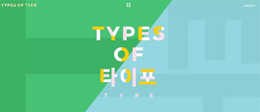Types of Type 這個網站就使用帶有色彩變化的巨大字母在背景中作為紋理,即使沒有用到漸變和陰影這樣的技巧,同樣也有深度,也足夠平衡。這樣的設計讓整個頁面顯得活潑而不乏味,對比使得整個設計主次分明。