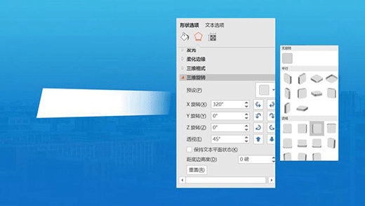 兩邊的透視效果,可以通過使用【三維旋轉(zhuǎn)】設(shè)計,兩邊形狀分別選擇【透視:右】和【透視:左】。